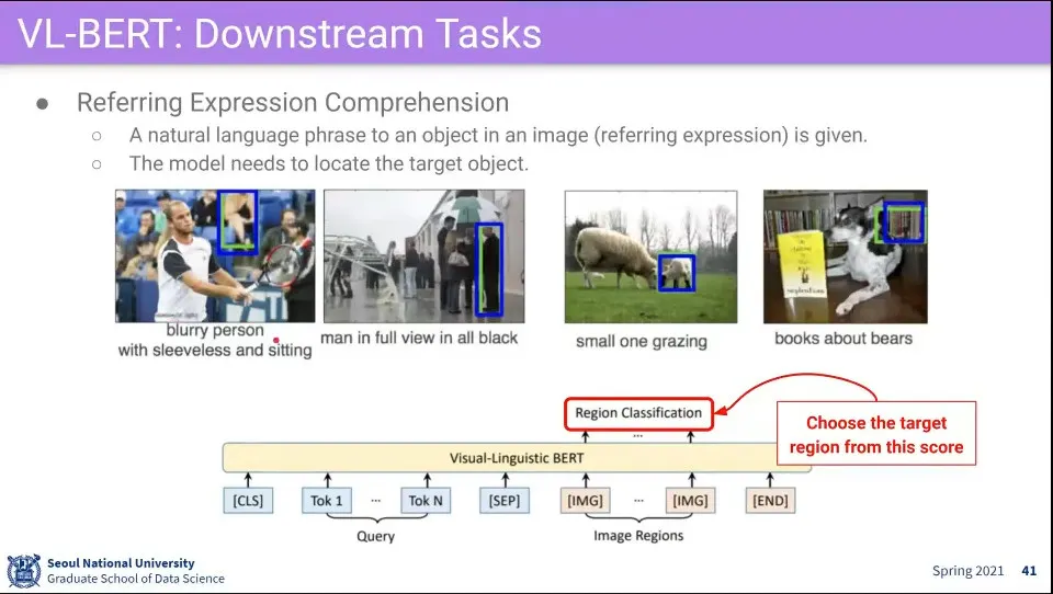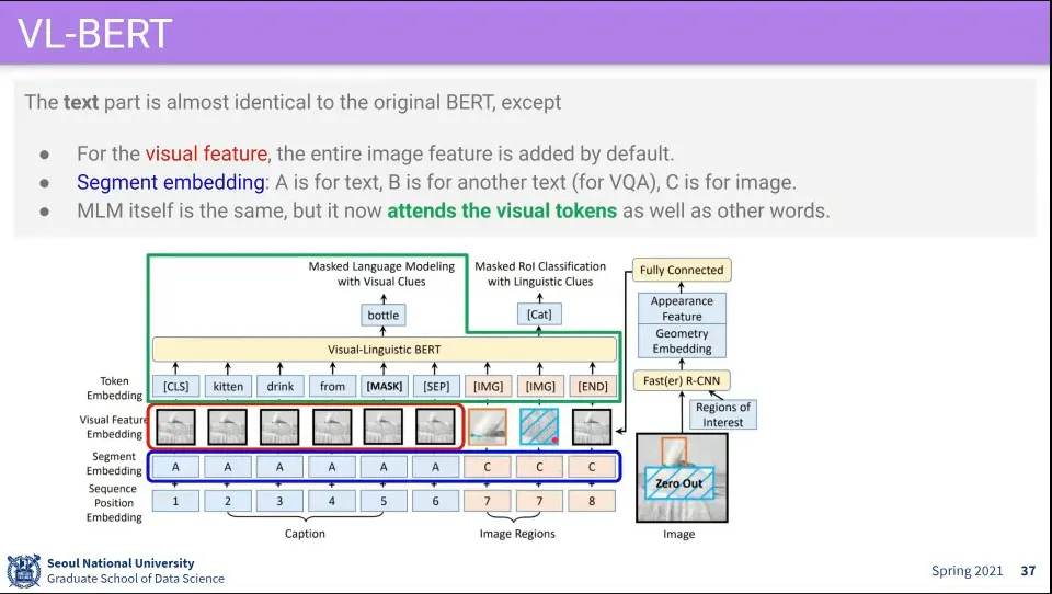 VL(Visual Language)-BERT 는 visual 정보와 language 정보를 BERT에 넣어서 사용함