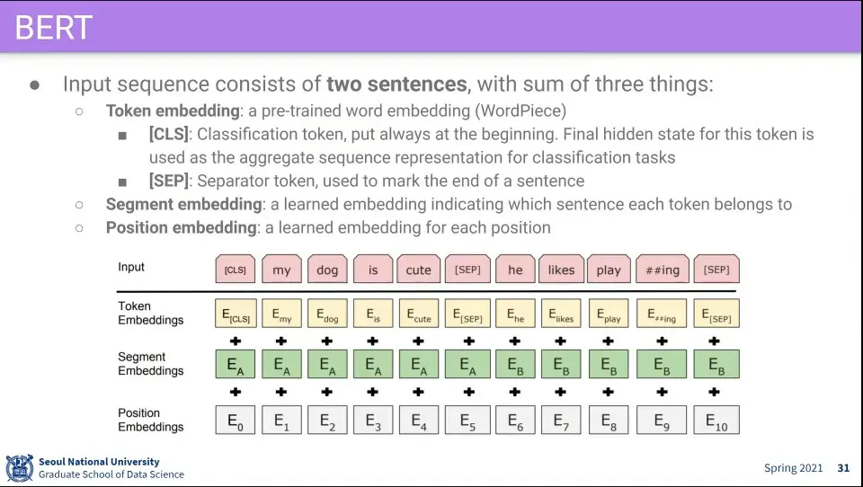 Input으로 3개의 Embedding —Token Embedding, Segment Embedding, Position Embedding— 을 만들고 이것들을 합해서 넣음