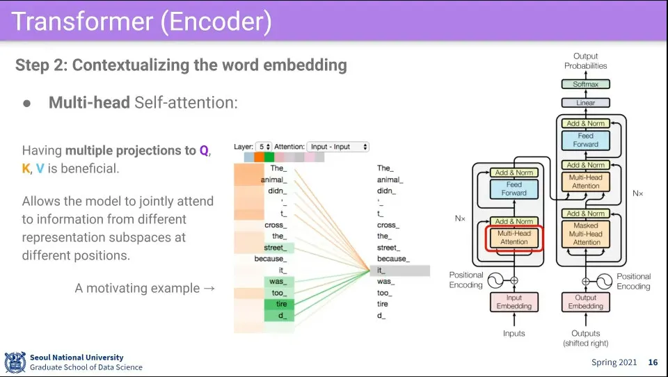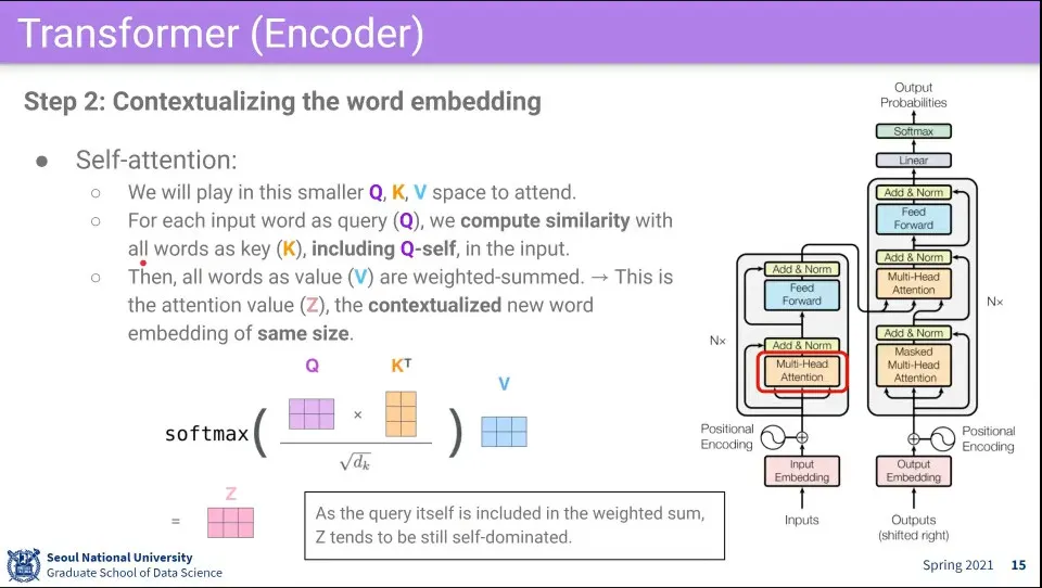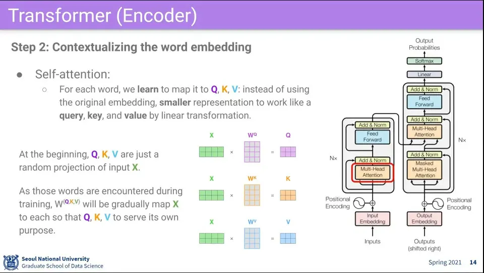 이때 각 단어는 Q, K, V 역할을 모두 수행하기 때문에 그것을 맵핑해주는 3가지 벡터를 사용함. 결국에는 이것을 학습하는게 핵심