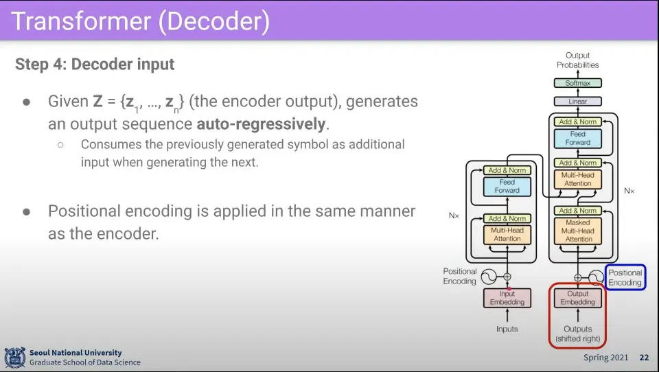 Decoder는 auto-regressively 동작함. -이전 output이 input이 된다는 의미