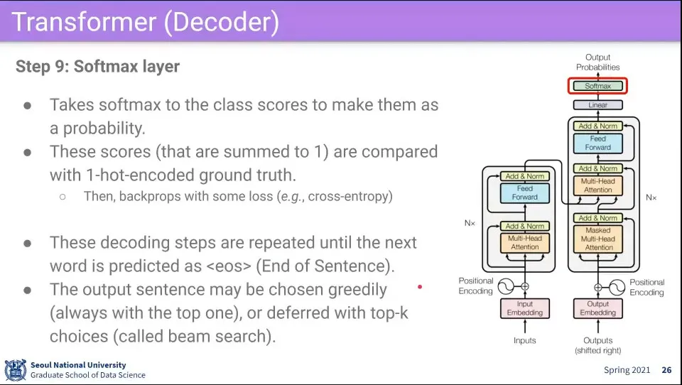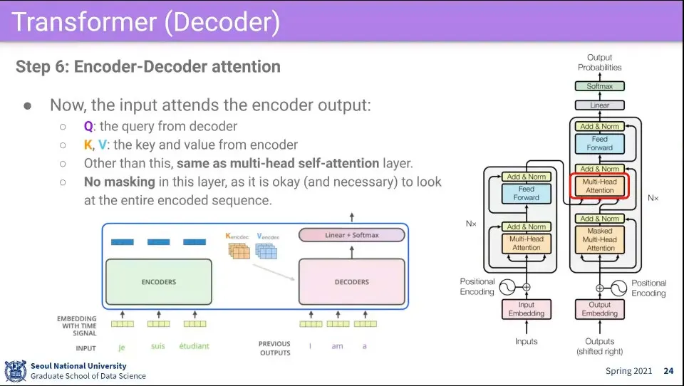 encoder에 들어왔던 원래 문장이 뭐였는지를 봐야 하기 때문에 이 단계에서는 Mask 없이 수행한다.