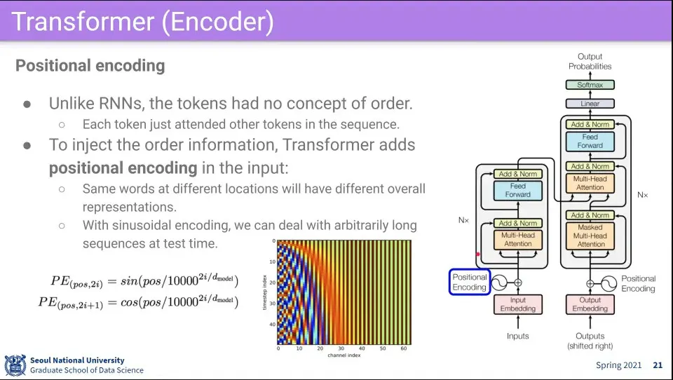 입력되는 단어가 모두 Q, K, V로 쓰이므로 단어의 순서의 의미가 없어지기 때문에, 순서 의미를 부여하기 위해 positional encoding을 해줌