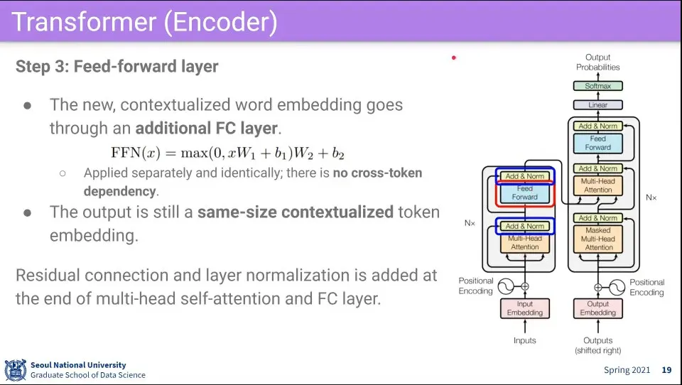 2단계를 통과한 것에 대해 Residual connection과 layer normalization을 수행하는데, 이것은 feed-forward를 통과한 것에 대해서도 수행해 준다.