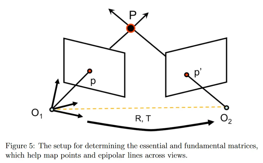 첫 번째 카메라가 기준계이므로 원점에 위치하고 방향이 월드 좌표계와 일치한다. 첫 번째 카메라의 위치를 두 번째 카메라로 평행이동 시키는 는 baseline 벡터가 되며, 따라서 의 크기는 baseline의 길이가 된다. 가 baseline 벡터이므로 는 3d점 와 두 카메라의 원점 를 포함하는 epipolar plane 위에 놓이게 된다.