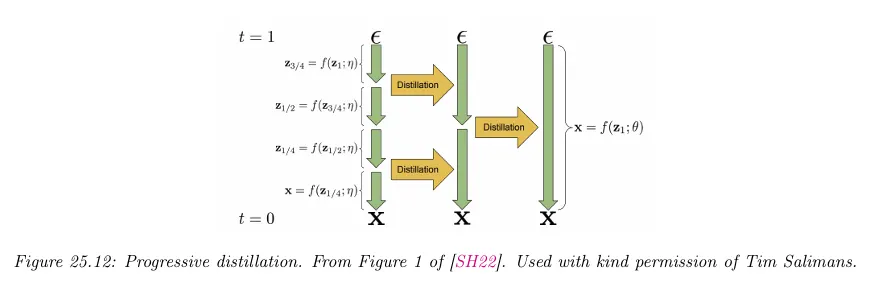 DDPM과 DDIM을 함께 사용하여 Distaillation 할 수 있다. 이것은 작은 단계로 높은 품질의 샘플을 생성할 수 있고 progressive distillation 이라 한다. 기본 아이디어는 다음과 같다.
