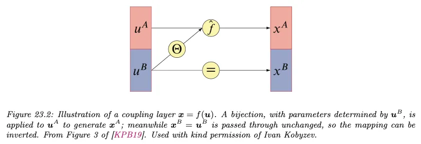 여기서 는 conditioner라고 부르는 임의의 함수로 종종 심층 신경망으로 구현된다. 와 를 통해 와 를 함께 결합하기 때문에 함수 를 coupling layer라고 부른다. 아래 그림 참조.