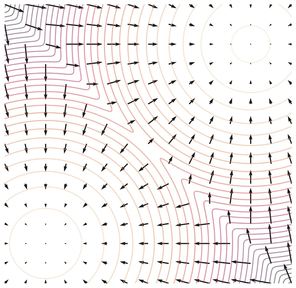 낮은 데이터 밀도의 영역에서 정확한 score 추정의 어려움을 어떻게 우회할 수 있을까? 우리의 해법은 데이터 포인트를 노이즈로 perturb(교란)한 다음 noisy 데이터 포인트에 score 모델을 학습하는 것이다. 노이즈 크기가 충분히 크면 낮은 밀도 영역을 채워서 추정 score의 정확도를 개선할 수 있다. 예컨대 가우시안 노이즈가 추가된 두 가우시안의 혼합을 교란할 때 무슨 일이 벌어지는지를 보여준다.