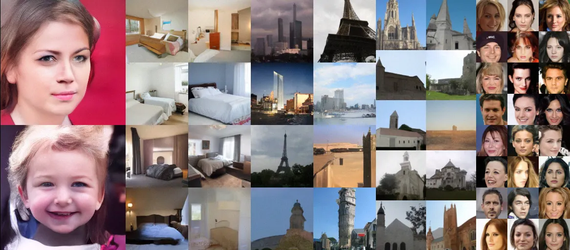 이런 모범 사례를 통해, 아래와 같이 다양한 데이터 셋에서 GAN과 비슷한 품질의 고품질 이미지 샘플을 생성할 수 있다.