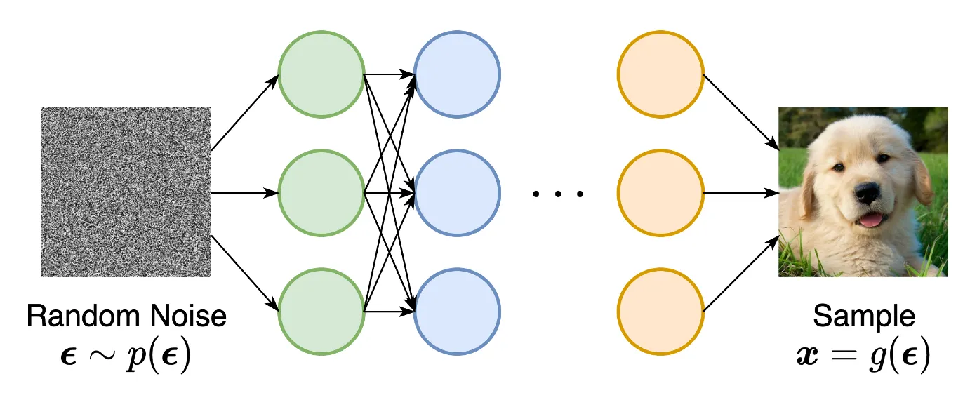 implicit generative models, 여기서 확률 분포는 샘플링 프로세스의 모델로써 암시적으로 표현된다. 가장 prominent(중요한) 예는 Generative Adversarial Networks(GANs)이다. 여기서 랜덤 가우시안 백터를 신경망으로 변환하여 데이터 분포에서 새로운 샘플을 합성한다.