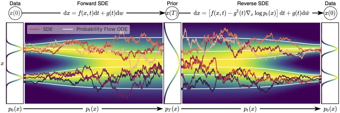 여기서 는 drift coefficient라고 부르는 벡터-값 함수이고 는 diffusion coefficient라고 부르는 실수값 함수이다. 는 표준 브라운 운동을 나타내고, 는 극소 white noise라고 볼 수 있다. SDE의 해는 확률 변수 의 연속 collection이다. 이 확률 변수는 시간 인덱스 가 시작 시간 에서 종료 시간 까지 증가함에 따라 stochastic 궤적을 추적한다. 를 의 (marginal) 확률 밀도 함수로 표기하자. 여기서 는 노이즈 스케일의 수가 유한할 때 과 유사하고, 는 와 유사하다. 에서는 데이터에 교란이 적용되지 않기 때문에 는 분명히 데이터 분포이다. 충분히 긴 시간 에 대해 stochastic 프로레스를 사용하여 를 교란한 후에 는 prior 분포라 부르는 다루기 쉬운 노이즈 분포 에 가까워진다. 유한한 노이즈 스케일의 경우에 는 와 유사하며, 이것은 데이터에 가장 큰 노이즈 교란 을 적용하는 것에 해당함에 주목한다.