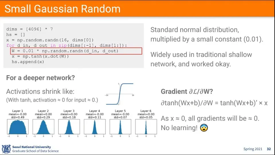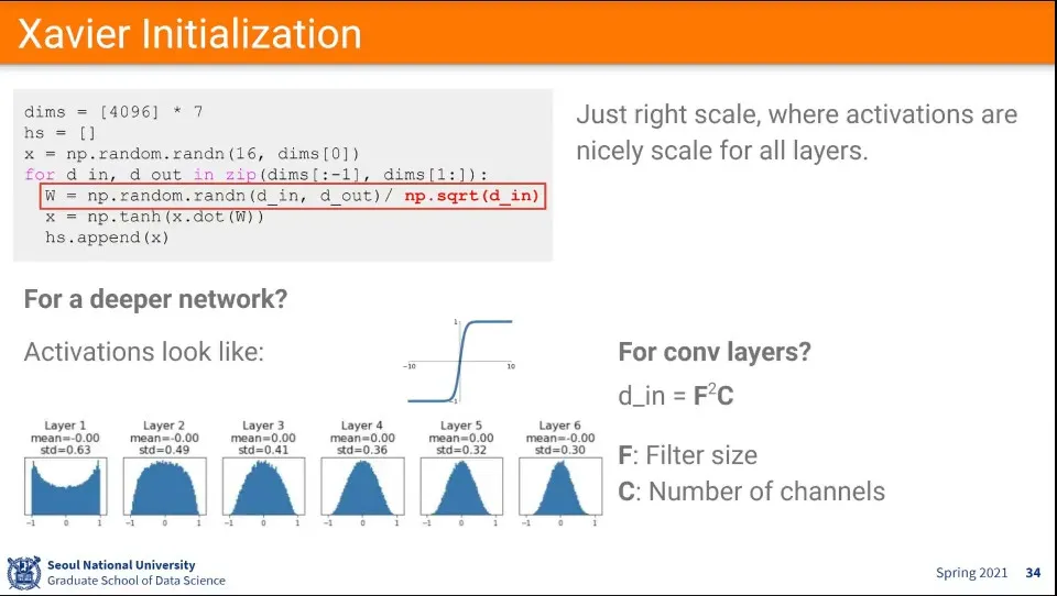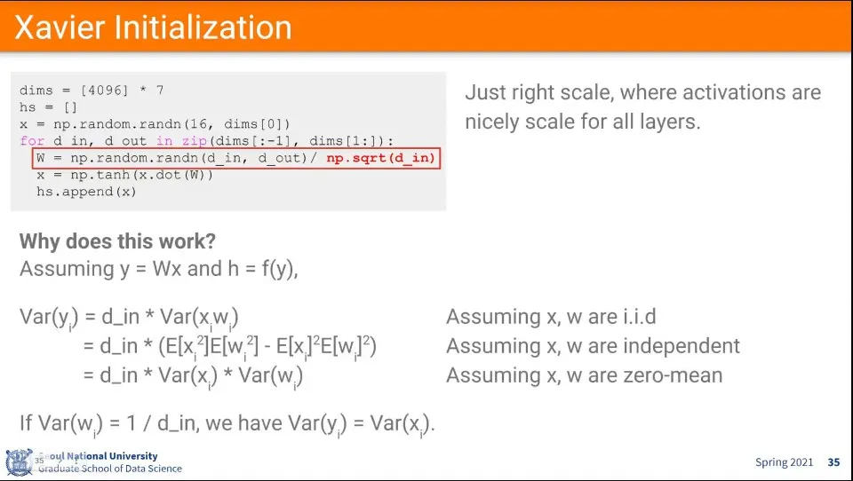 이를 해결하기 위한 대안으로 위와 같은 초기화 수식이 제안된다. - Xavier Initialization