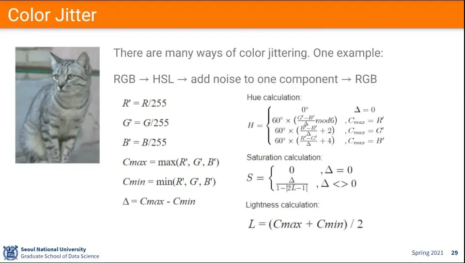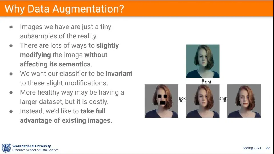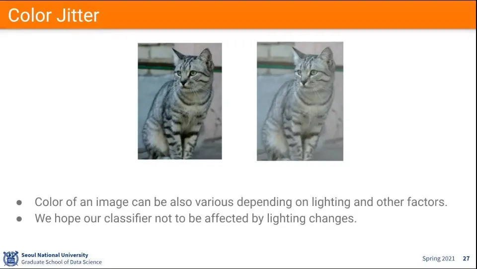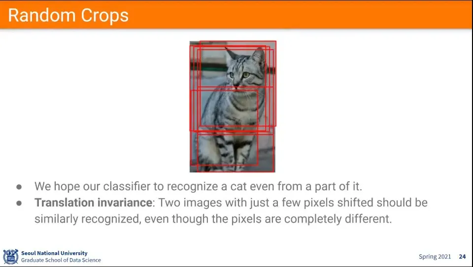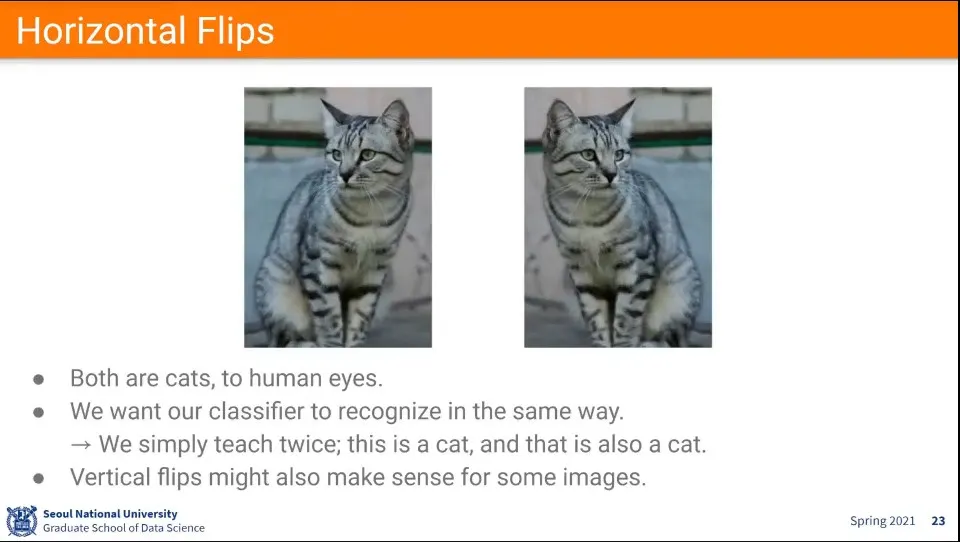 horizontal filp은 공짜로 쓸 수 있는데, vertical flip은 경우에 따라 좋을 수도 있고 안 좋을 수 있음. 중력 영향이 있는 경우에는 vertical flip이 어색하다.