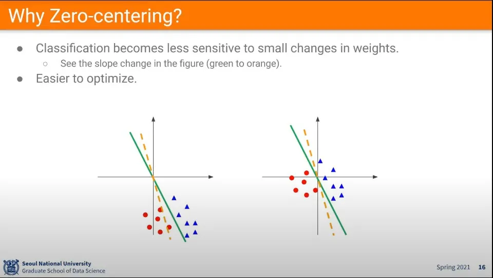 zero-centered를 안 하면 값이 조금만 바뀌어도 기울기가 크게 변해서 fitting이 쉽지 않음. 따라서 zero-centered를 하는게 좋다.