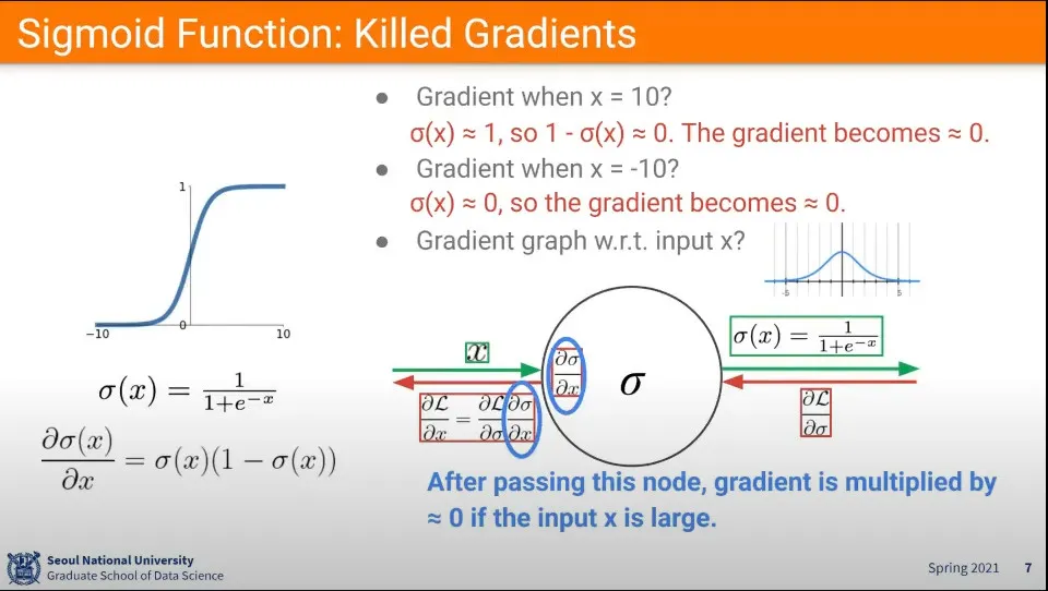 시그모이드 함수에서 input이 5이상의 큰 값이 들어오면 gradient가 0이 되게 됨.