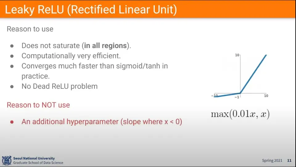ReLU의 문제를 개선해서 음수일 때 아주 작은 값을 사용하는 Leaky ReLU 방법이 나옴
