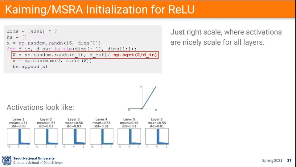 ReLU 초기화는 Kaiming/MSRA 초기화를 사용함