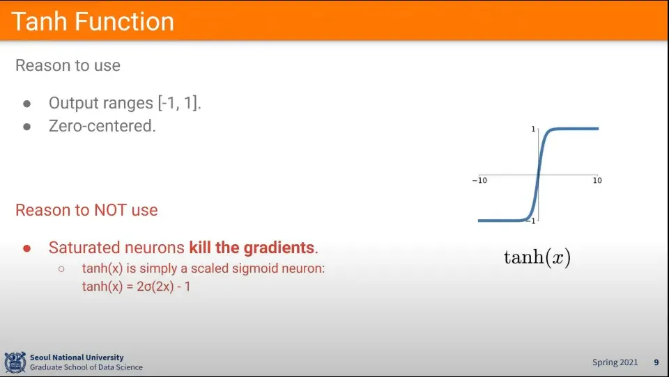 이유는 tanh를 로 편미분하면 의 모양이 되는데, 가 에 가까워지면 결과가 에 수렴하게 된다.