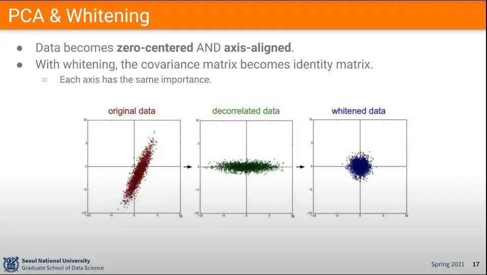 PCA는 zero-centering과 axis-aligned까지 하는 방법