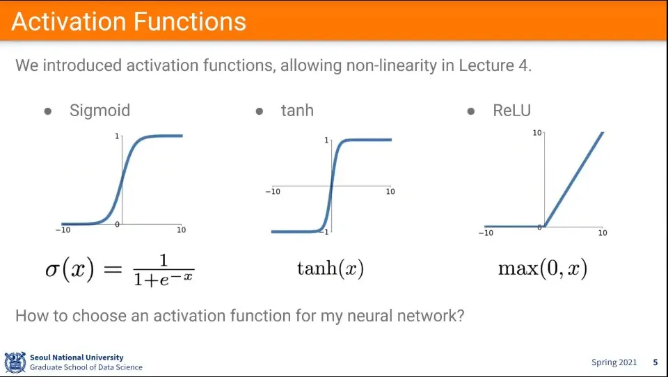 활성화 함수에는 Sigmoid, tanh, ReLU를 많이 사용한다.