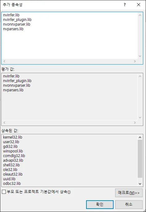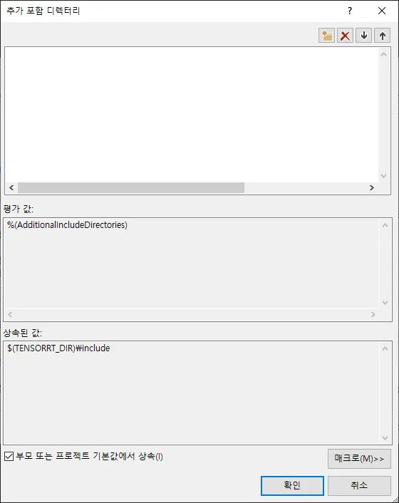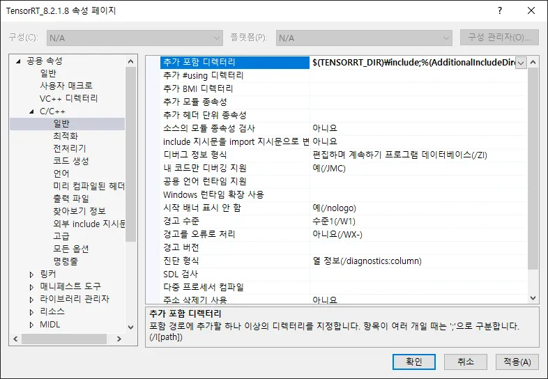 생성한 속성 시트를 더블 클릭 → C/C++ → 일반 → 추가 포함 디렉터리에 아래의 TensorRT의 헤더파일 경로 추가