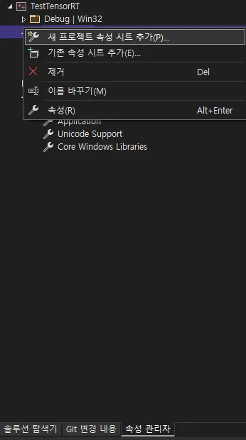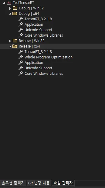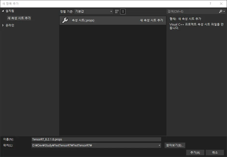 TensorRT는 Debug, Release 구분이 없으므로 Debug에 하나 만들고, Release에서는 기존 속성 시트 추가를 해서 Debug의 속성 시트를 사용하도록 한다.