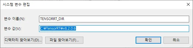 이후 설정의 편의를 위해 환경변수를 만들어서 TensorRT가 있는 폴더를 등록한다. —이렇게 만들어서 세팅하면 이후 설치 버전이 바뀌어도 나머지 설정은 건드리지 않고 값만 바꾸어도 빌드가 된다.