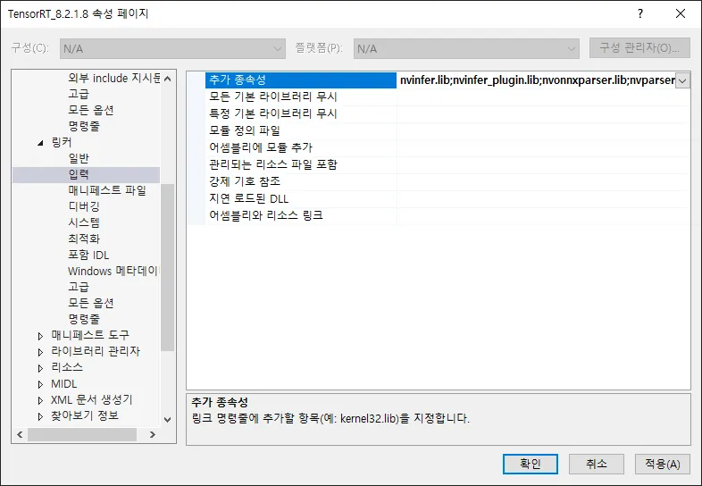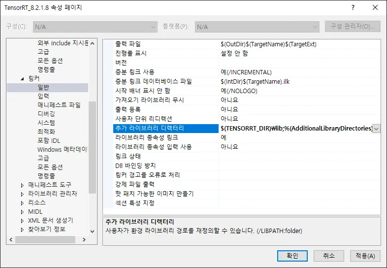 생성한 속성 시트를 더블 클릭 → 링커 → 일반 → 추가 라이브러리 디렉터리에 아래의 TensorRT의 라이브러리 경로 추가