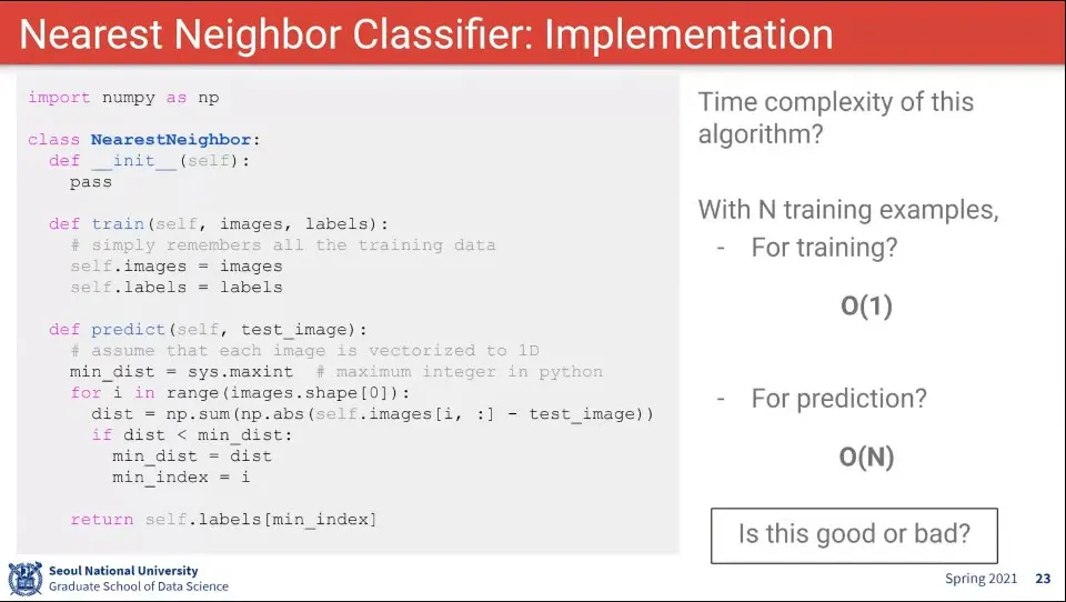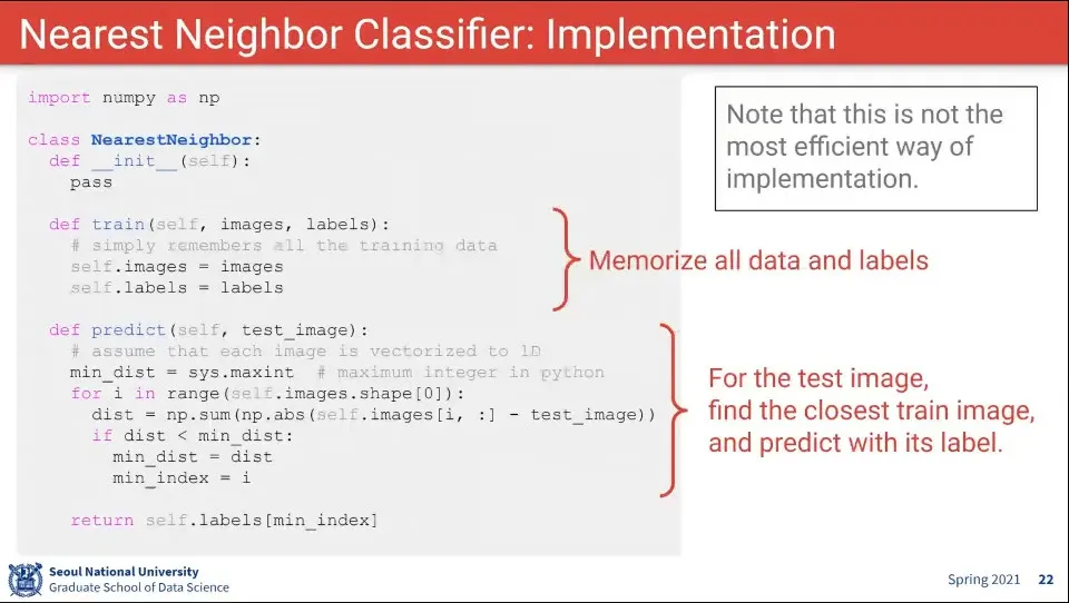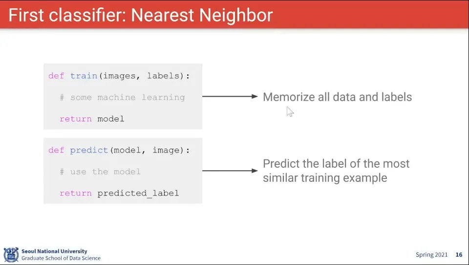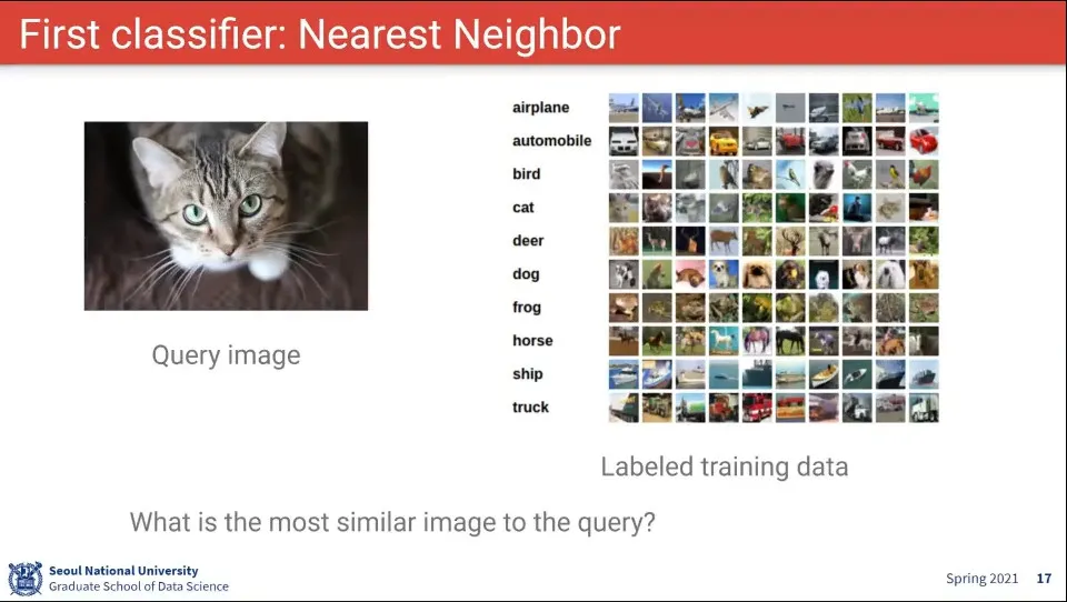 Nearest Neighbor Classifier는 데이터를 그냥 저장해 두고 있다가, 이미지가 입력 되면 저장된 데이터에서 가장 가까운 것을 찾는 것
