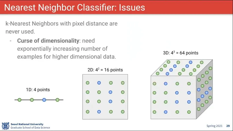차원이 늘어날 수록 필요로 하는 데이터의 숫자가 exponential 하게 커짐