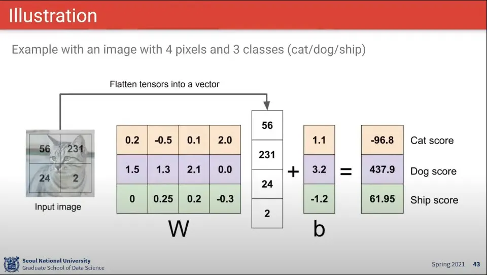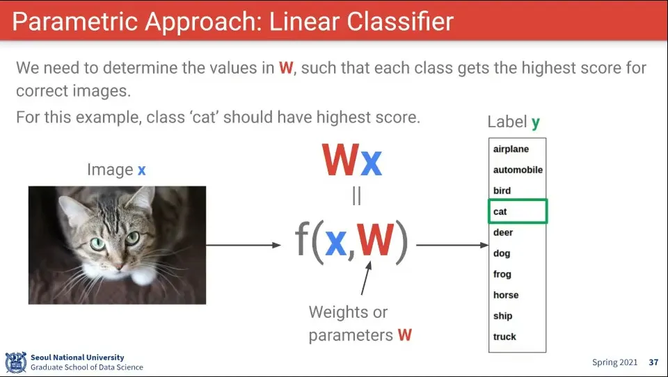 함수는 input x와 학습된 Weight 를 선형으로 결합해서 Label을 출력해주는 모델을 생각할 수 있다.