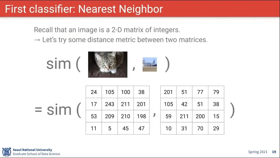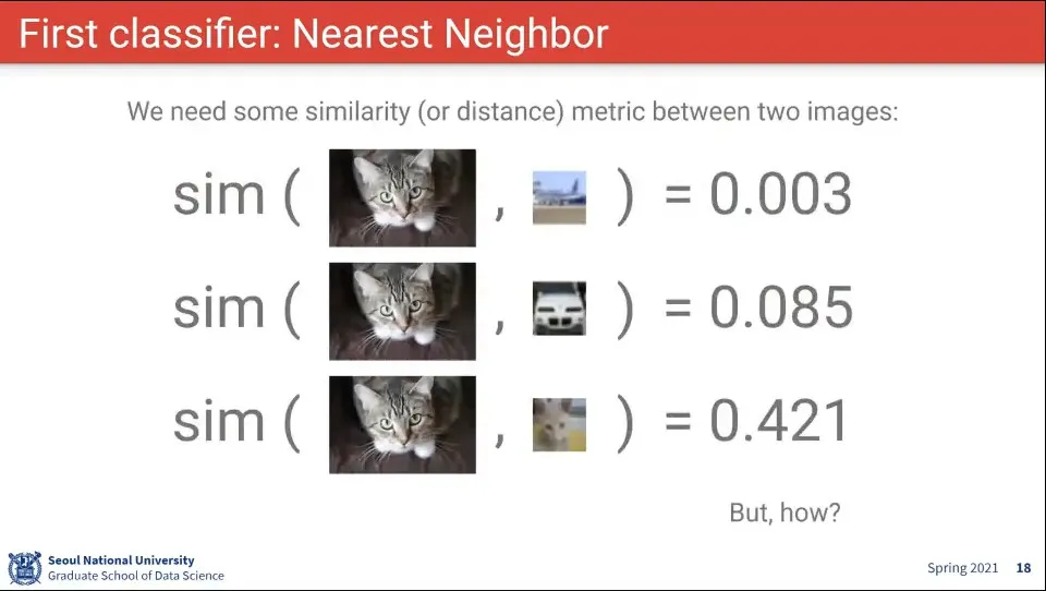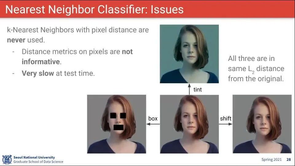 Nearest Neighbor로는 위와 같은 문제가 있음. 사람이 보기에는 같지만, 픽셀 정보면 조금 다르게 한 것을 구분하지 못 함