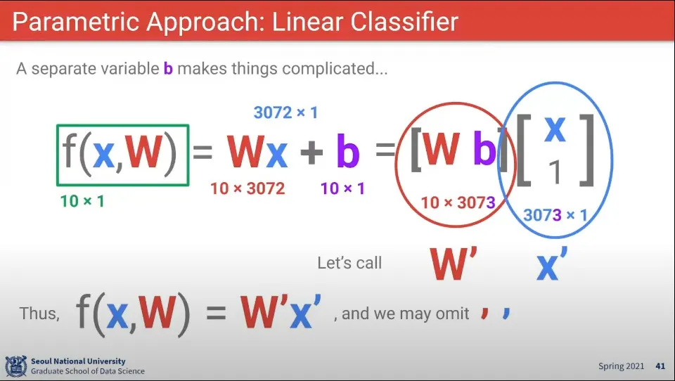 위와 같은 예에서 이미지 x와 파라미터 W, 편향 b의 크기는 위와 같이 생각할 수 있다.