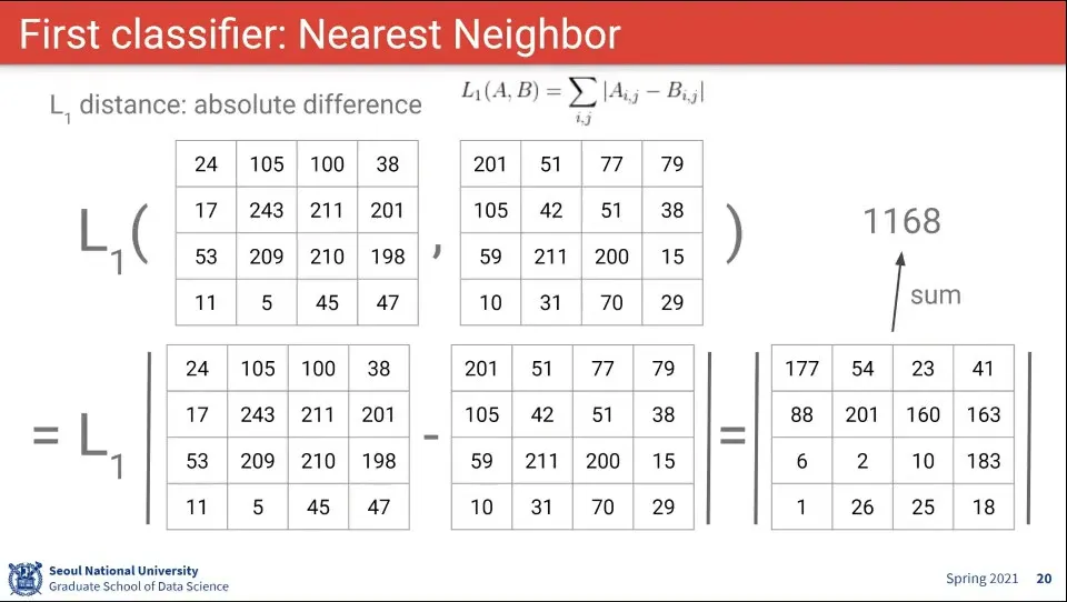 L1 거리를 적용하면 위와 같다. 차이의 절대값의 합