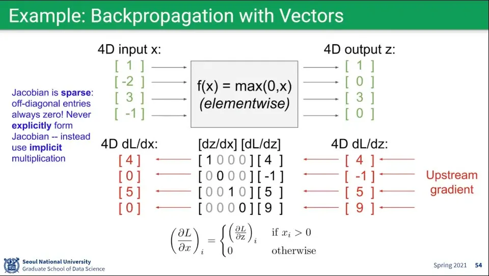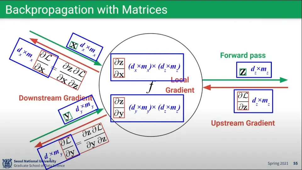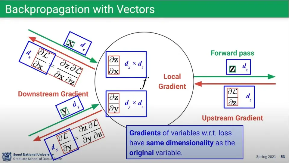 이때 벡터끼리 곱해지는 Local Gradient는 Matrix가 만들어지게 되는데, Upstream Gradient와 Downstream Gradient과 곱하기를 하면 차원이 상쇄되어서 다시 벡터 형태로 만들어진다.