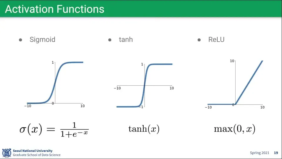 활성화 함수로는 Sigmoid, tanh, ReLU 등을 많이 사용한다.