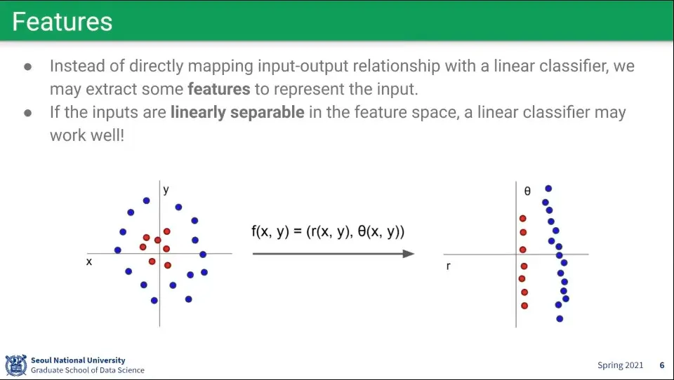 비선형 데이터를 오른쪽처럼 선형으로 변환해서 선형 함수를 적용할 수 있을까?