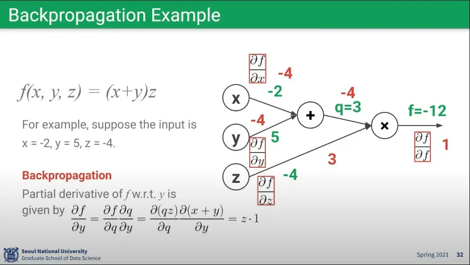 Backpropagation은 다음 노드에서부터 거꾸로 계산되는데, 이때 현재의 편미분은 다음 노드의 편미분을 이용해서 계산할 수 있다. 이것을 Chain Rule이라고 함.