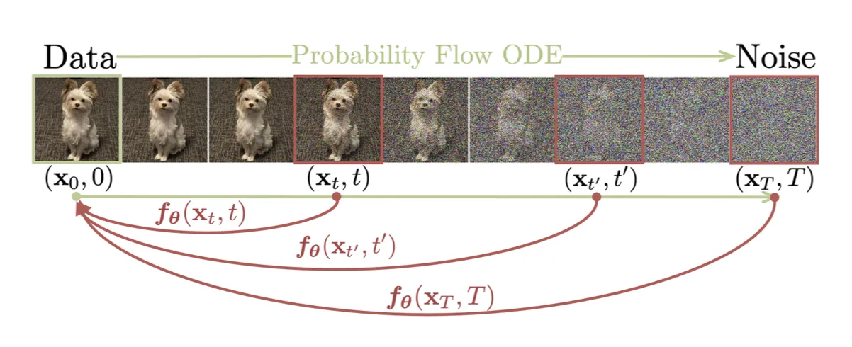 Consistency Model은 diffusion 샘플링 궤적에서 임의의 중간 noisy 데이터 포인트 을 원본 에 직접 매핑하는 방법을 학습한다. 동일한 궤적에 있는 데이터 포인트가 모두 동일한 원점에 매핑되는 self-consistency라는 속성 때문에 consistency model이라 불린다.