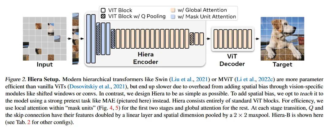 Hiera는 ViT에 계층구조를 도입한 Encoder를 의미한다. 이것은 ViT에 계층구조를 도입한 이전의 supervised 모델인 MViTv2를 self-supervised 형식으로 개선한 모델이다. self-supervised 방식으로 학습하기 때문에 MViTv2에 있던 여러 component들 중 불필요한 것들(pooling attention, conv 등)을 모두 제거할 수 있었고 그 결과 동일한 또는 더 우수한 성능을 발휘하면서 더 가볍고 빠른 모델이 되었다.