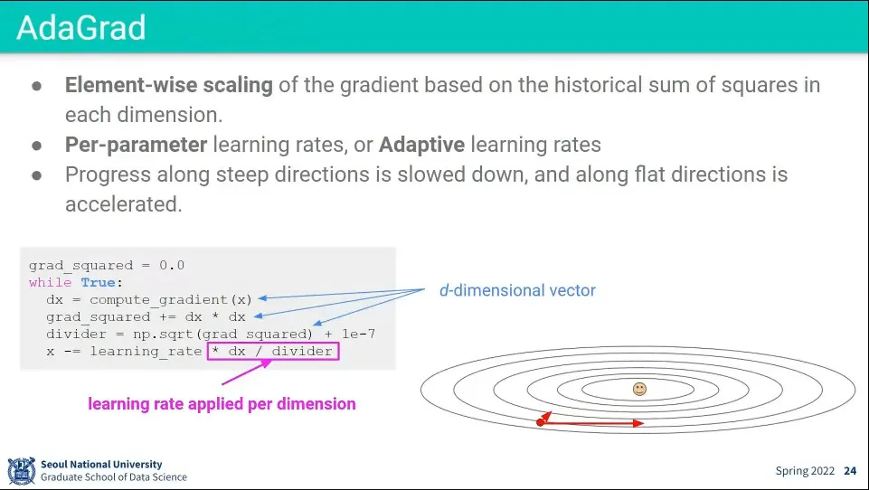 어느 Dimension에 얼마의 Learning rate이 적절한지를 알 수 없기 때문에 학습하면서 계산함.