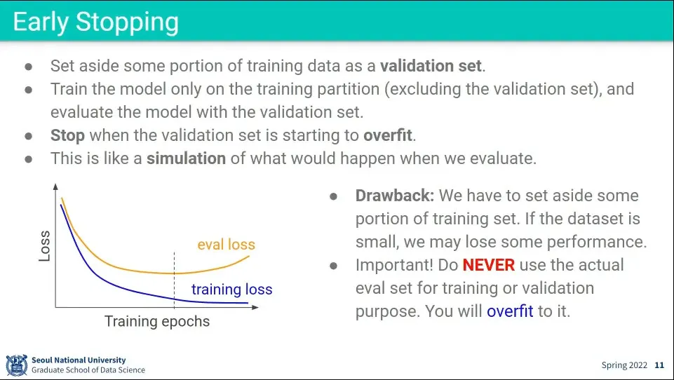 Early Stopping이란 validation set을 따로 만들어두고, overfitting이 발생하기 시작할 때 학습을 중지하는 것