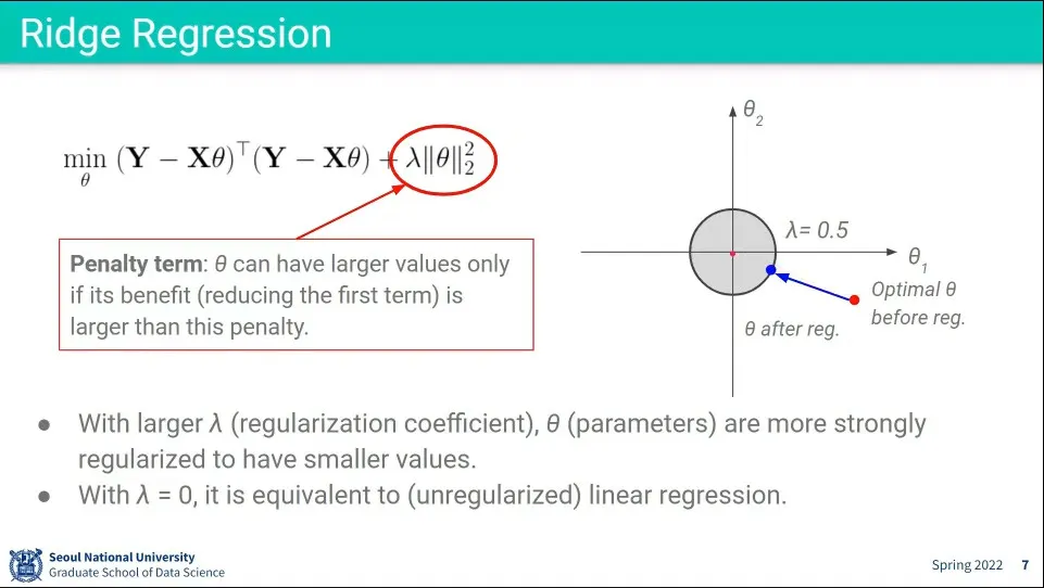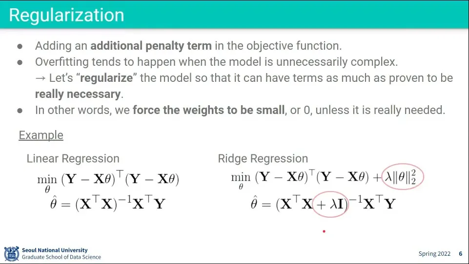 머신러닝에서는 가중치 를 구하게 되는데, 이 를 강제로 더해줘서 규제를 사용함
