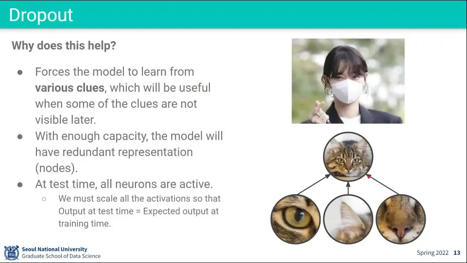 dropout을 하지 않으면 대상의 한, 두 가지 특징에 overfitting 될 수 있다. 그래서 강제로 노드를 꺼서 최대한 다양한 특징을 학습 할 수 있도록 함
