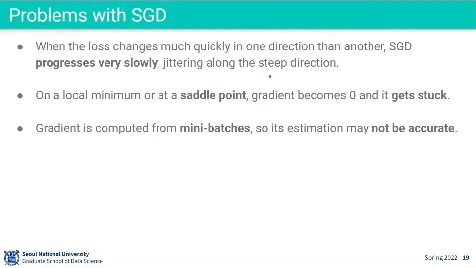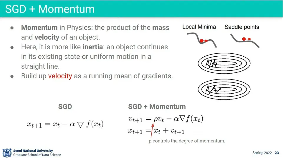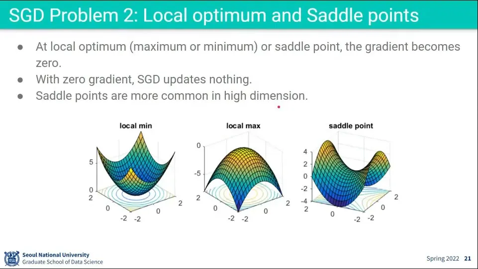 이렇게 하면 saddle point를 통과할 수 있음. 미분은 0이지만 관성이 있었기 때문에 움직일 수 있음
