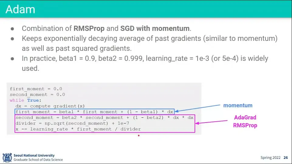 Adam은 Ada + momentum으로 앞선 Momentum과 RMSProp을 모두 사용하는 방법이다.