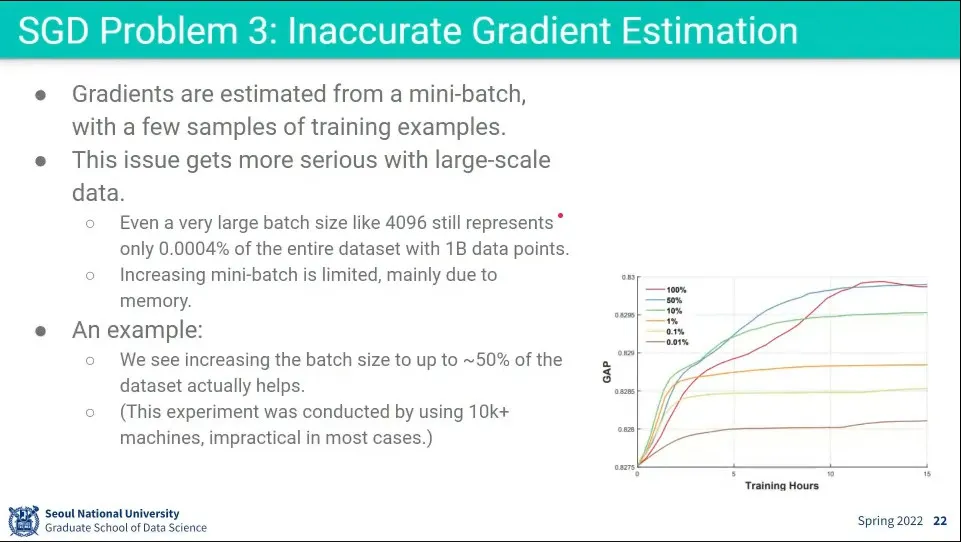 mini-batch는 메모리 한계로 한 번에 넣을 수 있는 크기의 한계가 있어서 4096도 엄청 큰 사이즈인데, 만일 전체 데이터셋이 10억개였다면 0.0004%의 데이터만 대변하게 됨
