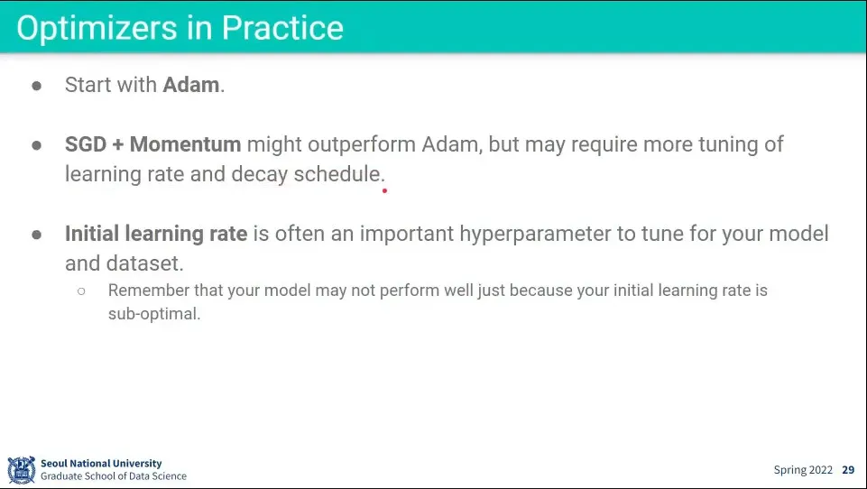 가장 발전된 방법이기 때문에 일단 시작할 때는 Adam으로 시작함
