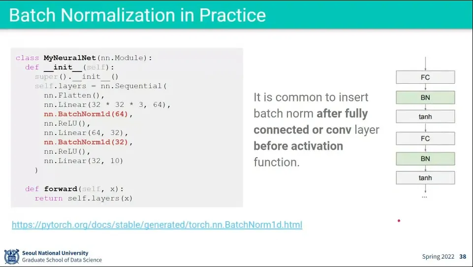 PyTorch에 Batch Normalization Layer을 추가할 때는 Activation Layer 전에 넣으면 된다. input 데이터를 normalization 해주는 개념이기 때문