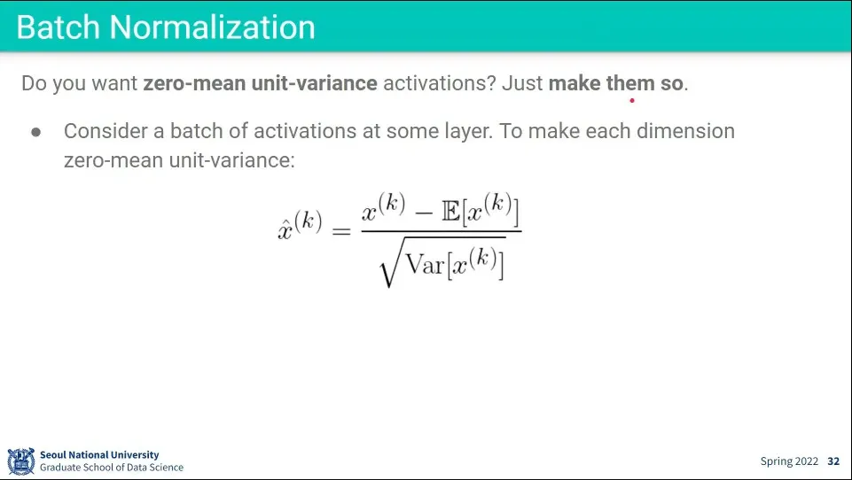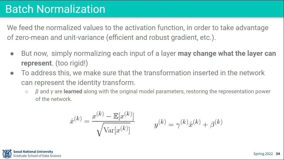 고로 batch normalization 할 때는 앞에 normalization 하는 것과 함께 뒤에 원복하는 것도 넣어줘야 한다.
