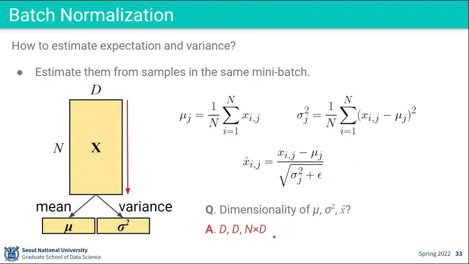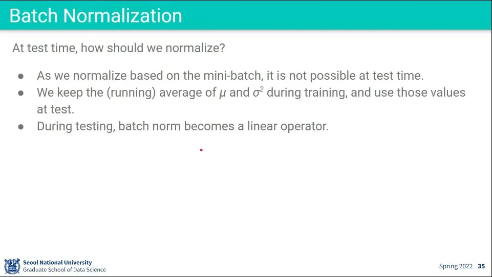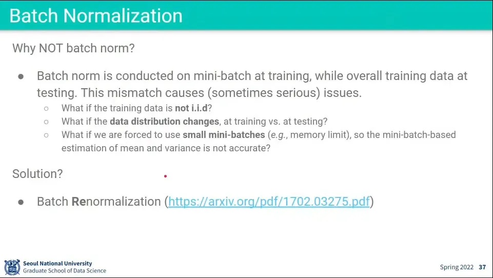 또한 만일 학습 데이터 자체가 큰 경우 mini batch 크기가 작아질 수 밖에 없는데 —메모리 크기의 한계로— 그런 경우 그 mini batch에서의 평균과 분산이 전체 데이터를 얼마나 잘 반영할 수 있느냐는 확신할 수 없음.